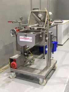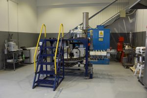 Equipo piloto utilizado para realizar recubrimiento de aceite al pellet (couting), tiene una capacidad de 5 kg de pellet por batch, cuenta con doble eje de paletas de velocidad variable, el vacío es provocado por una bomba de paleta de vanos la cual alcanza unos 900 mbar de vació, además tiene sistema pivotante de la tolva para la descarga de producto.